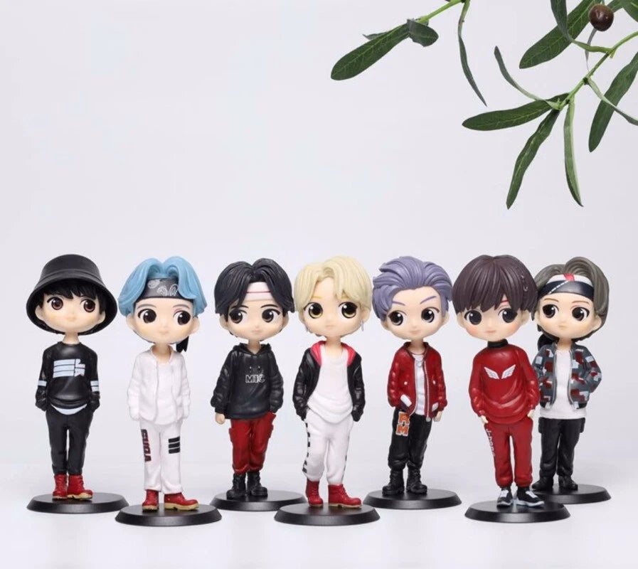 Bring the iconic BTS members to your collection with this 7-piece Q Posket action figure set. Featuring all seven members in chibi-style dynamic poses, this collectible highlights their detailed outfits, expressive faces, and signature hairstyles, capturing the charm and personality of the global K-pop sensation.
